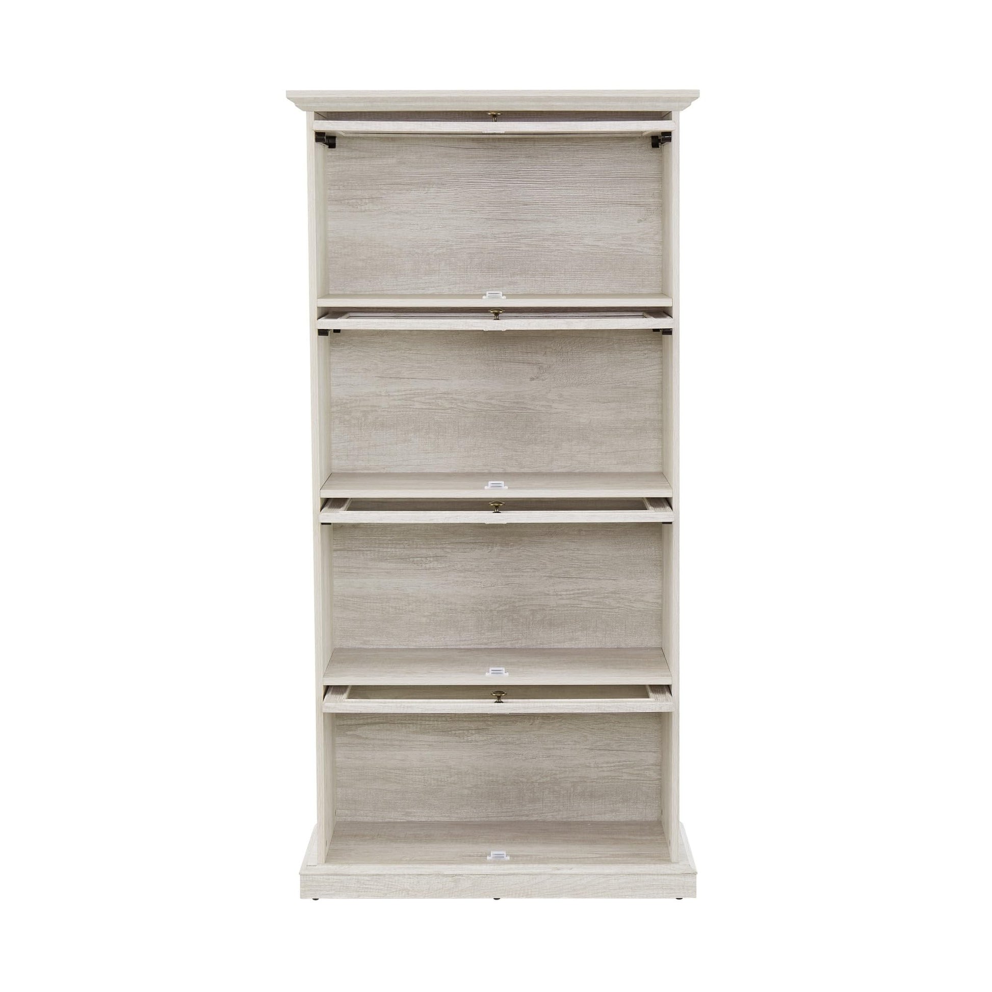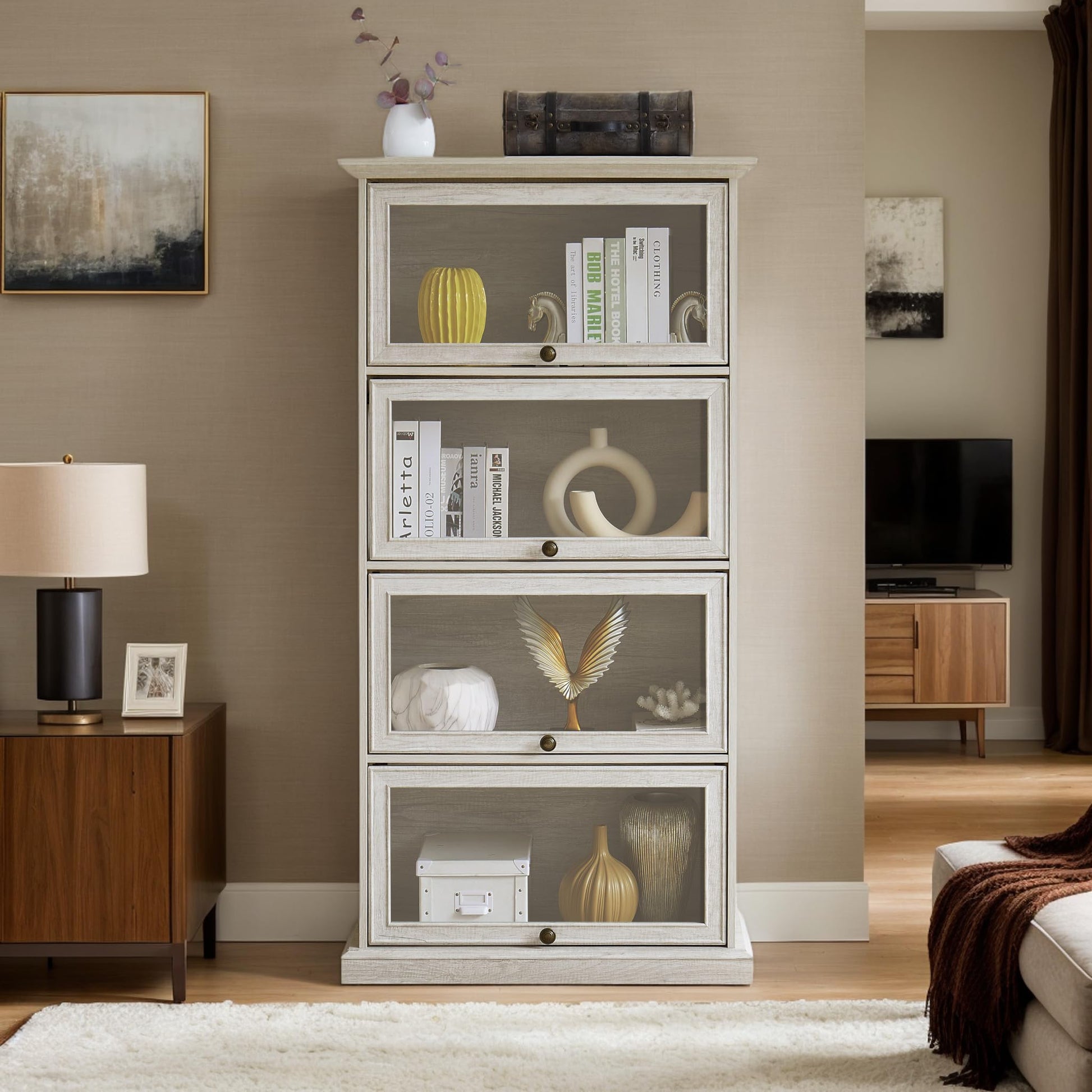 Tall Bookcase with Glass Doors, 63" H Glass Curio Display Cabinet with Flip up Doors, Elegant Storage Cabinet with 4-Tier Shelves, Rack for Living Room